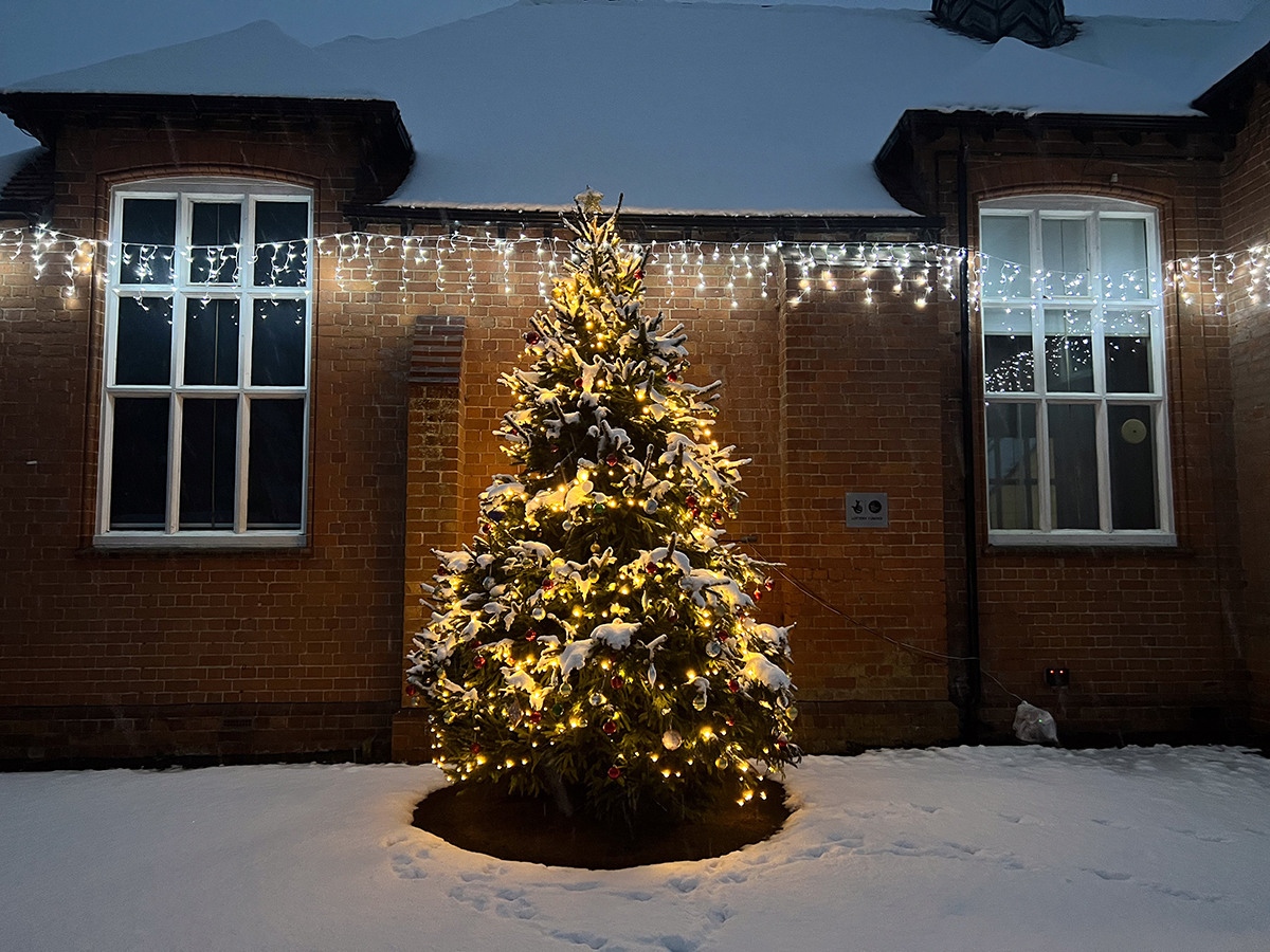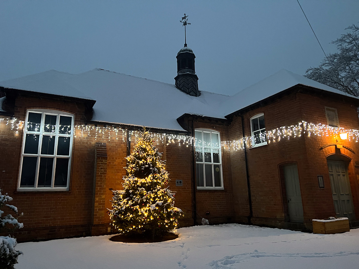 The Village Christmas Tree lit up with the Hall – Christmas has arrived!